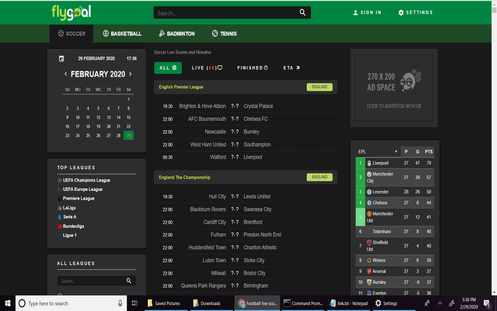 Flygoal baru-baru ini dikeluarkan, membuat maksud online terlengkap di dunia buat live skor bola langsung buat lebih dari 1. 000 liga serta kejuaraan di pelosok dunia. Situs ini tawarkan kabar komplet terkait skedul olahraga, hasil kompetisi, serta urutan klub.